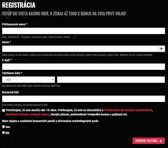 - pokračujte vyplnením registračného formulára. Zadajte: Prihlasovacie meno, Heslo, E-mail, Telefónne číslo, Bonusový kód (ak nemáte bonusový kód, ponechajte prázdne).